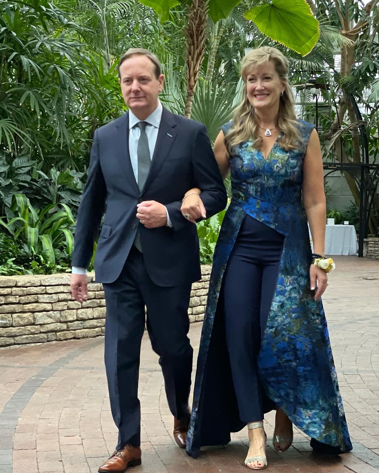 Monet jacquard, sleeveless, V-neck walk thru jumpsuit with asymmetrical skirt and stretch crepe ankle length pants.